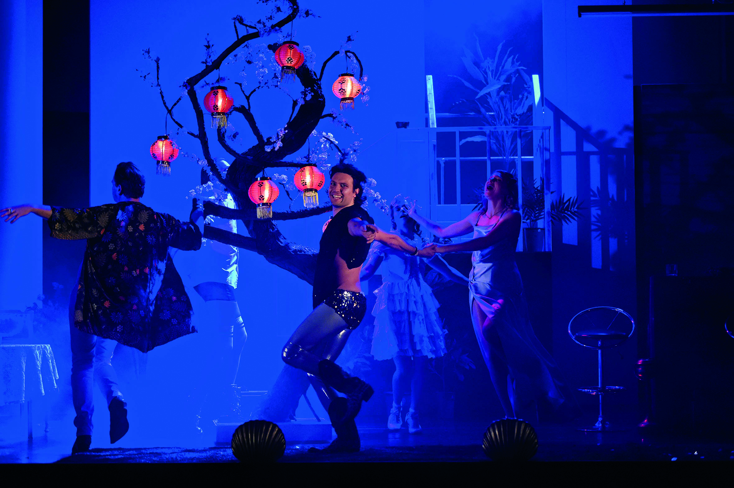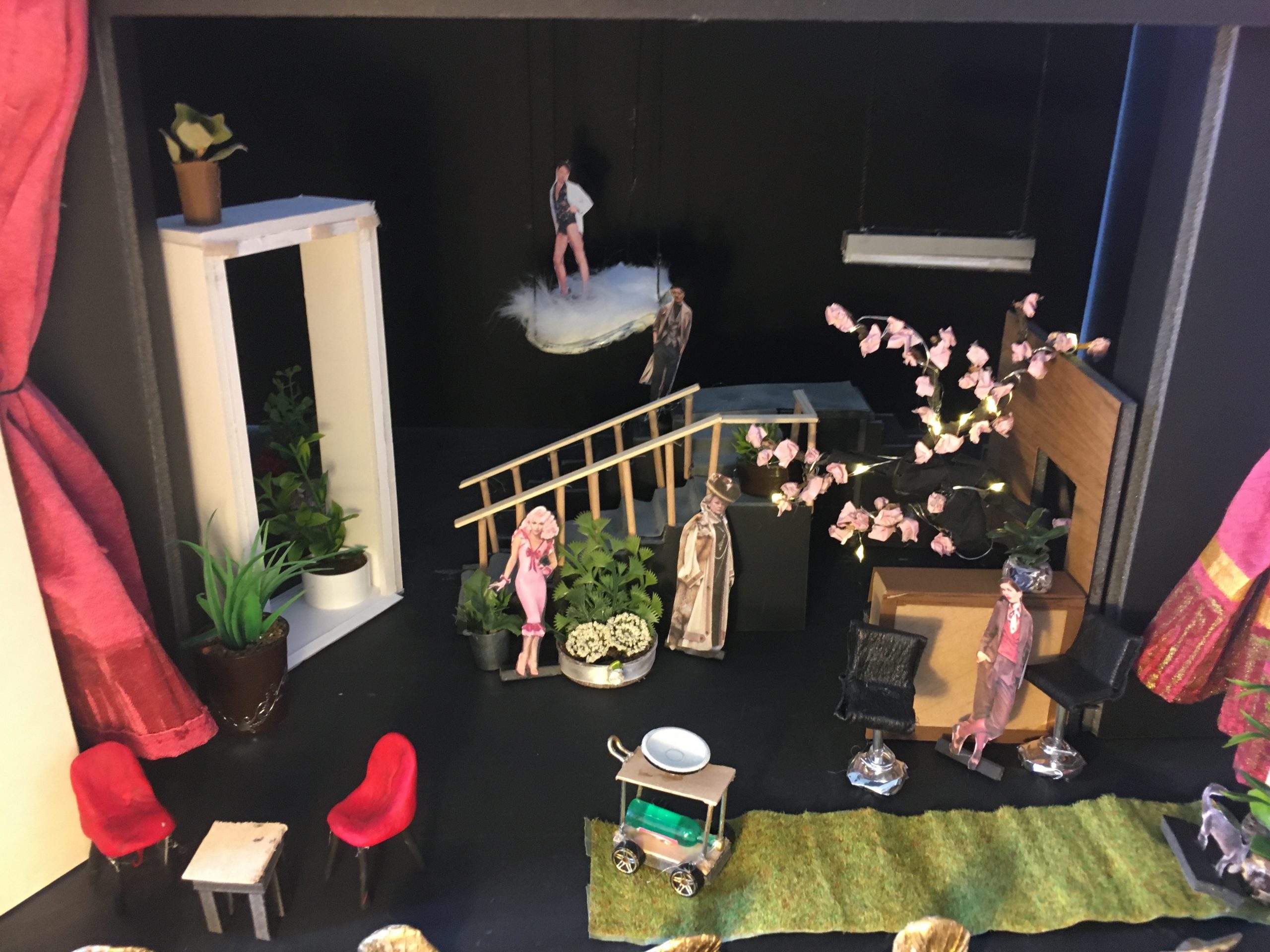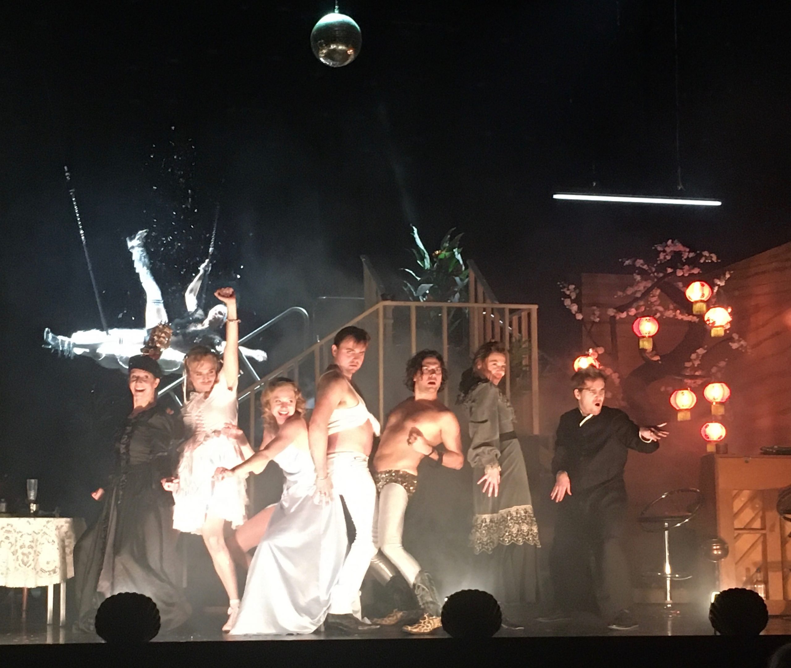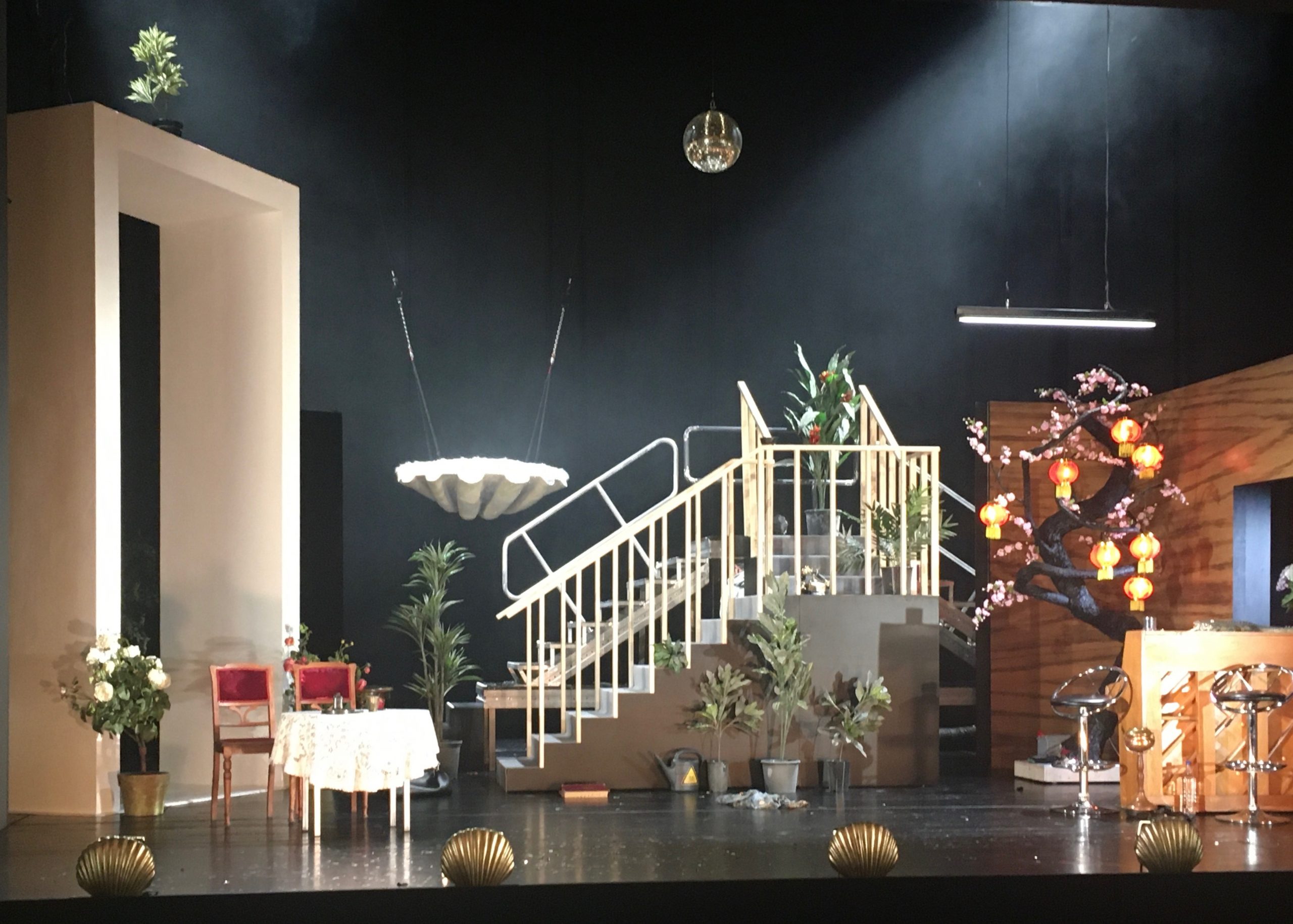 Spektakulärer offener Umbau für den zweiten Akt. Highlight: In Hubwagen Genie setzt zur Krönung ein Schauspieler einen kleinen Blumentopf auf 4 Meter Höhe. Kostüm Highlight: Der rauschende Schiffs-Hut von Lady Bracknell im 3. Akt. Glitzernde Flockati- Muschel- Schaukel .